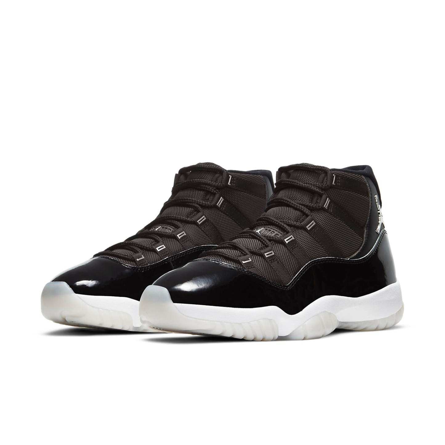 Nike Air Jordan 11 Retro “Jubilee 25th Anniversary ” dressed in Black, Sliver color scheme with a metallic silver Jumpman. The JORDAN on the eyelets and the classic glossy patent leather in piano black.