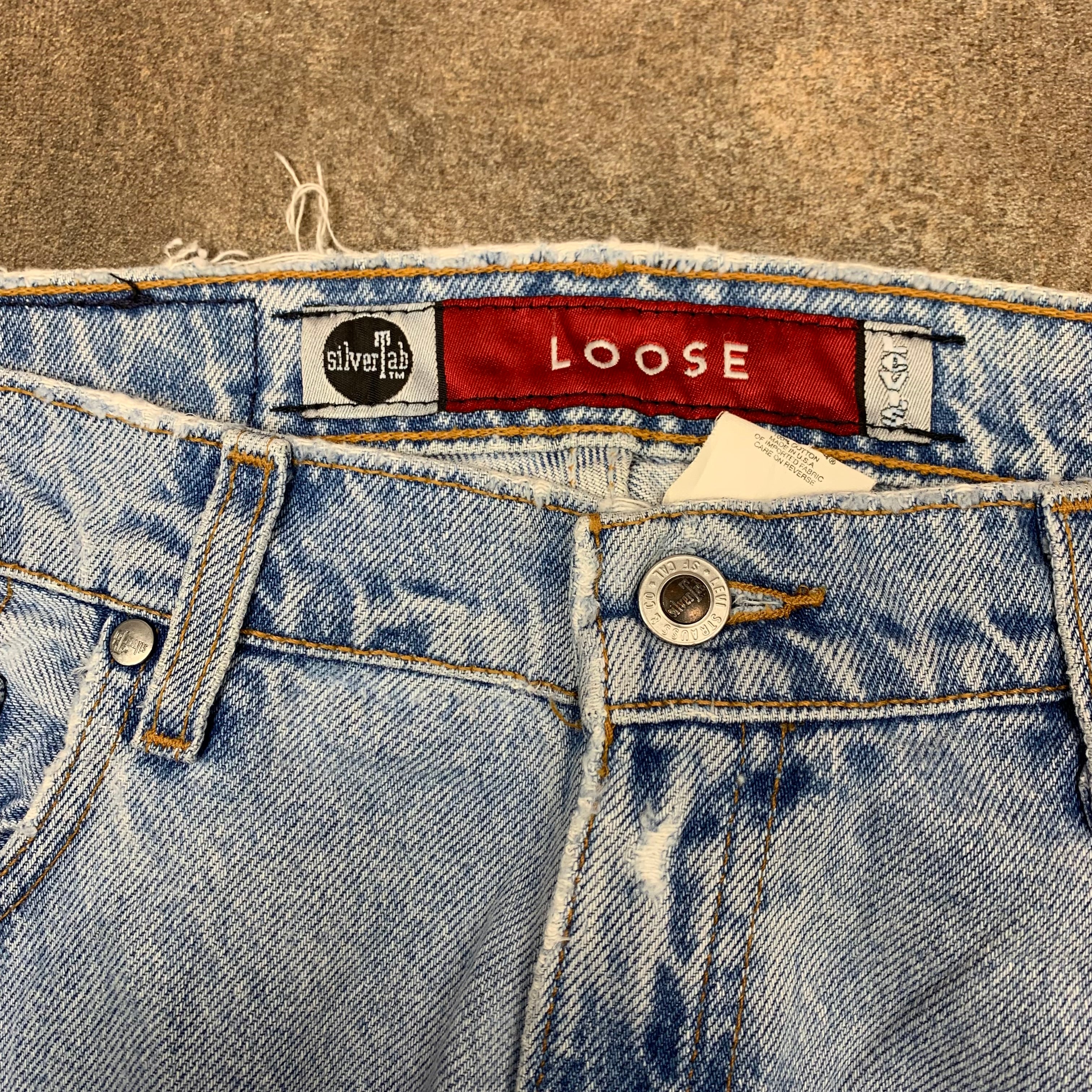 Vintage Silvertab jeans in a baggy / wide leg fit, coloured pale blue all over and in good second hand condition with a repair on the back / marks as shown.