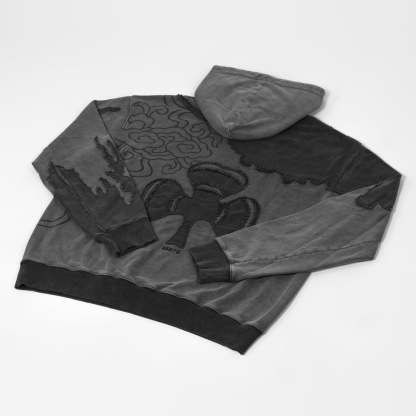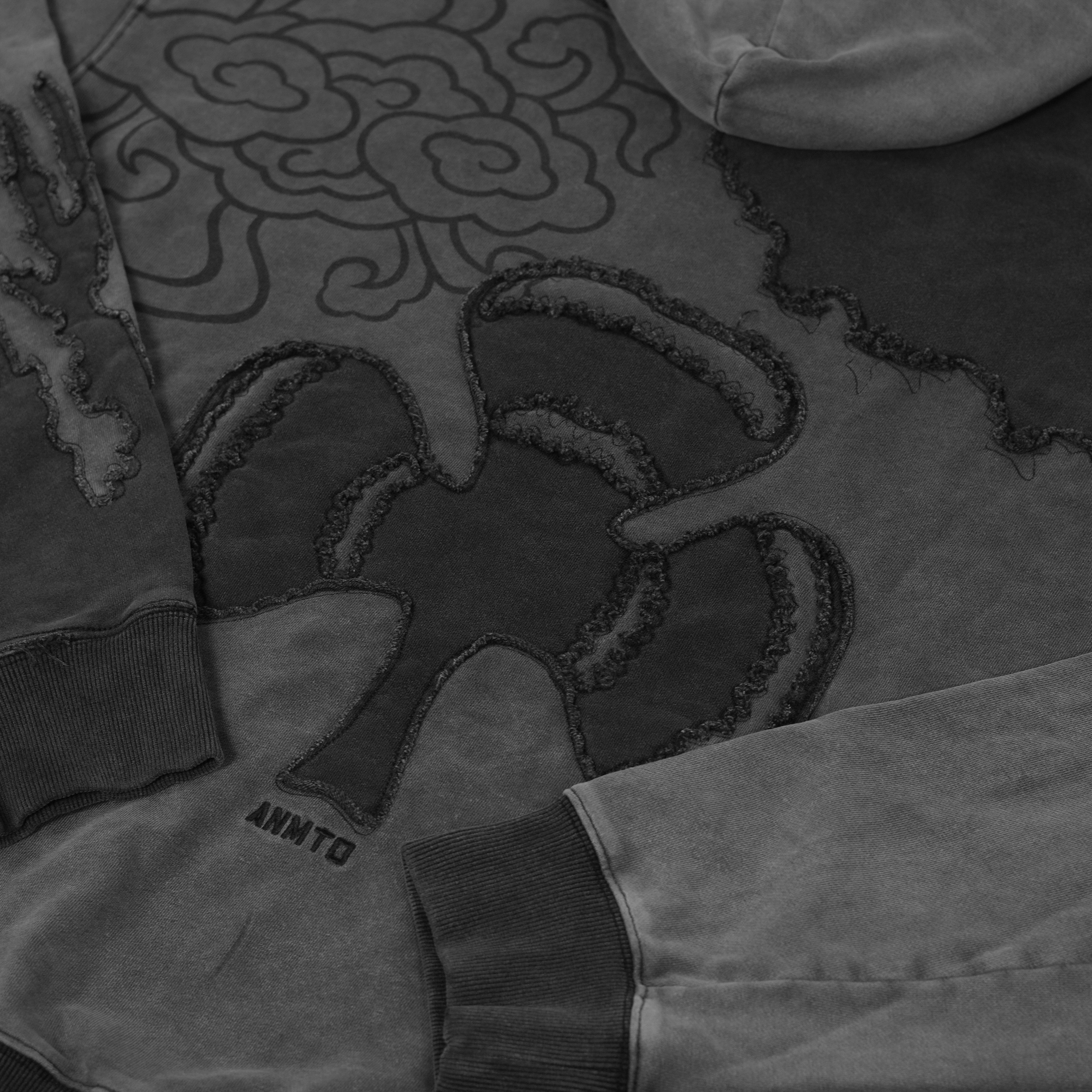 The design is fully embroidered on this premium custom cut and sew heavyweight French terry hoodie. The front features applique and embroidery made in a way to mimic the character's ragged cloak! One sleeve has a rising darkness applique design to complete the look. On the back is a large fabric-cut applique design of the three leaf clover as well as a faded print of the cloud pattern found on his grimoire. The whole hoodie has an acid wash! This hoodie's fabric is very high quality and it is very breathable and flexible with a unique texture on the inside.