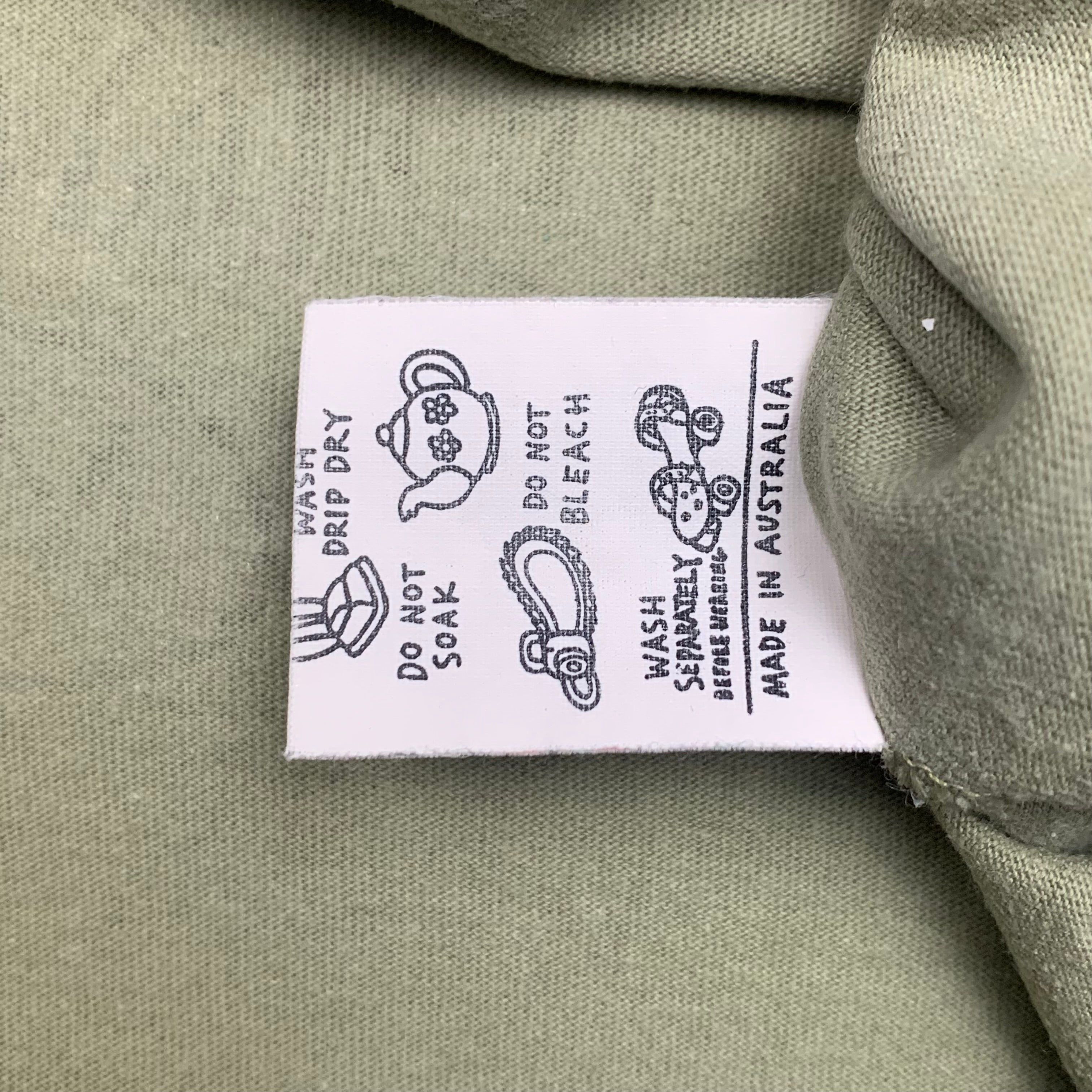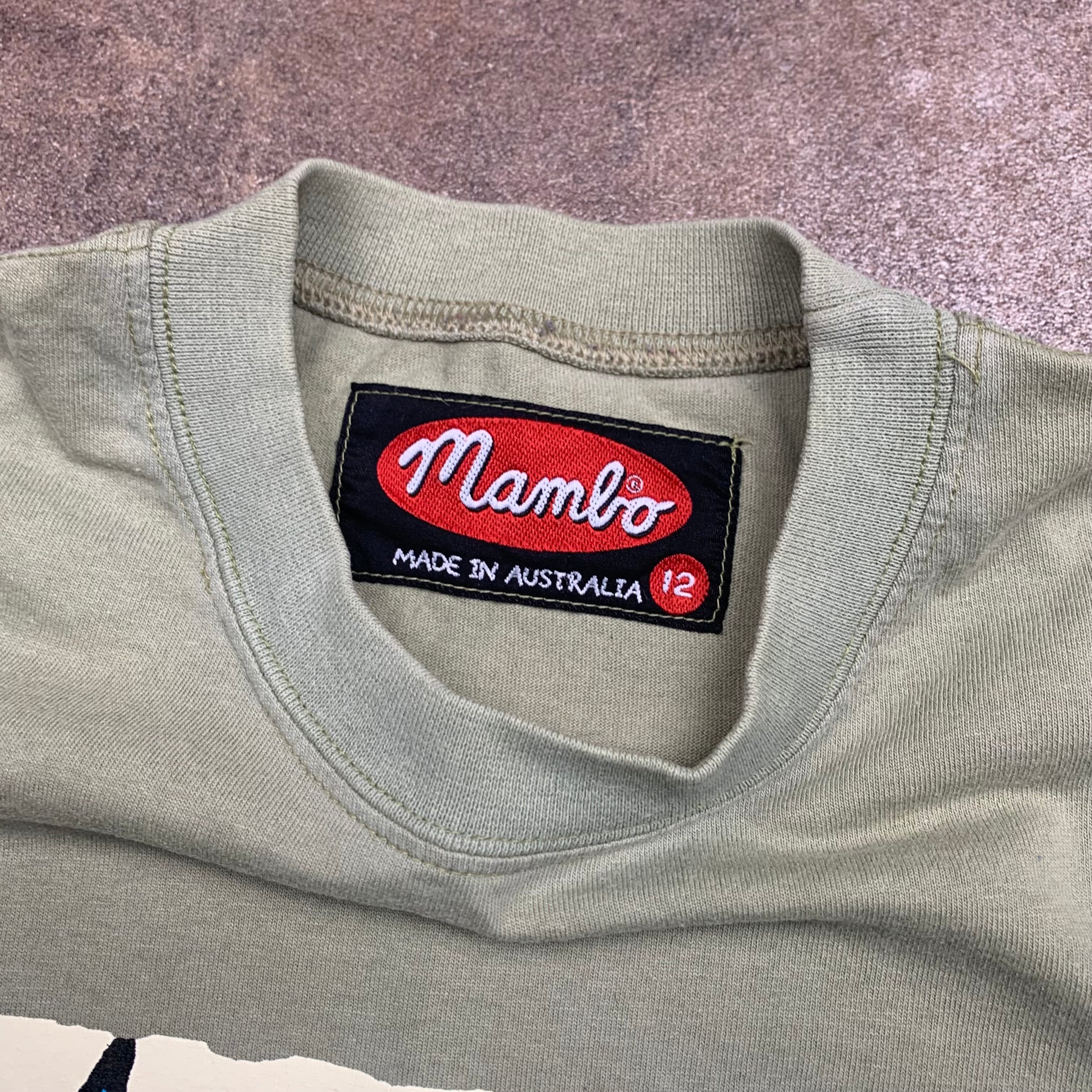 Rare Mambo tee with printed graphics front and back, coloured green all over and in excellent second hand condition with unnoticeable discolouring on the front and a repair to the back of the neck.
